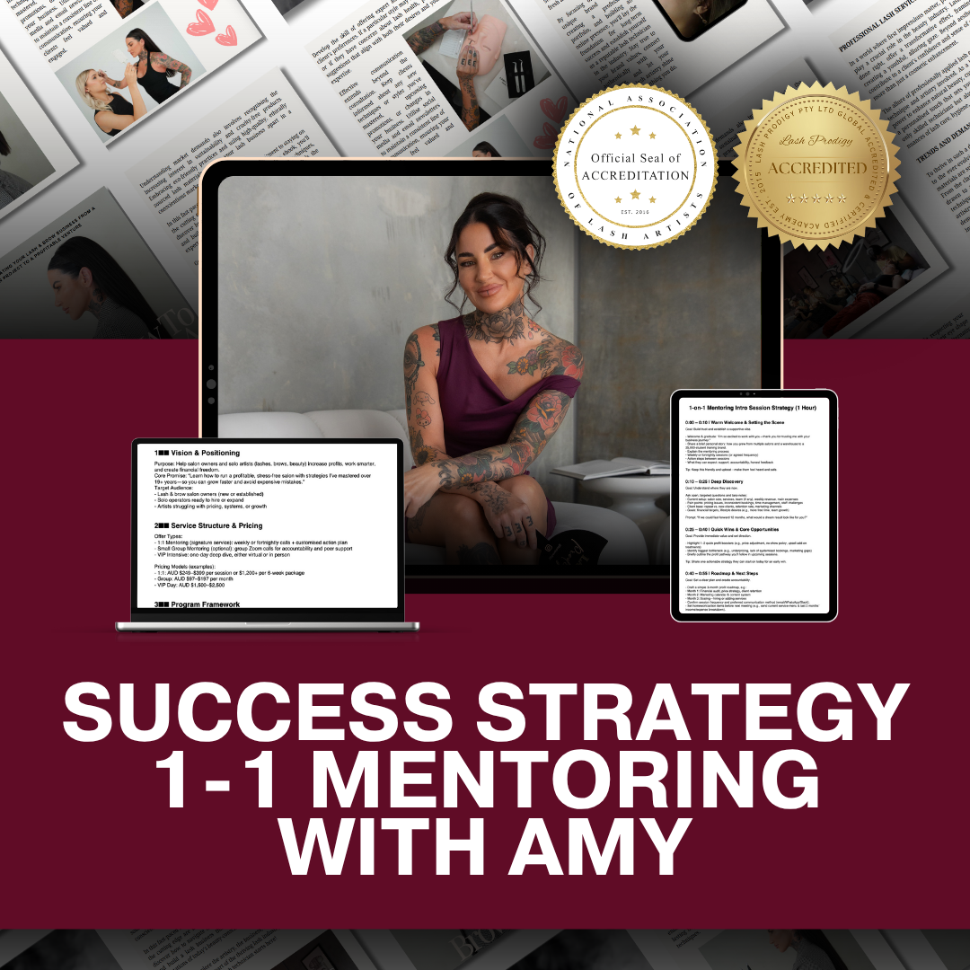 In this private 1-on-1 mentoring session, Amy Williams—founder of Lash Prodigy with 19+ years in the beauty industry and over 25,000 students worldwide—will personally guide you through the exact steps to maximise profits and create financial freedom.